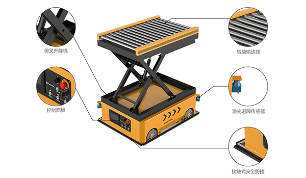 麥克納姆輪全方位任意全向移動(dòng),非接觸式激光避障傳感器及車身有接觸式防撞機(jī)構(gòu)除需日常充電外,無(wú)其他維護(hù)成本;設(shè)備運(yùn)行時(shí)有聲光警示;并設(shè)有系統(tǒng)故障診斷及電量顯示功能;控制面板顯示屏實(shí)時(shí)狀態(tài)顯示,并顯示故障信息; 輥筒輸送實(shí)現(xiàn)不同高度物料對(duì)接,實(shí)現(xiàn)輸送柔性化; 帶起升功能剪叉升降機(jī),實(shí)現(xiàn)輥筒的升降;根據(jù)工況需求搭載不同的導(dǎo)航方式;
