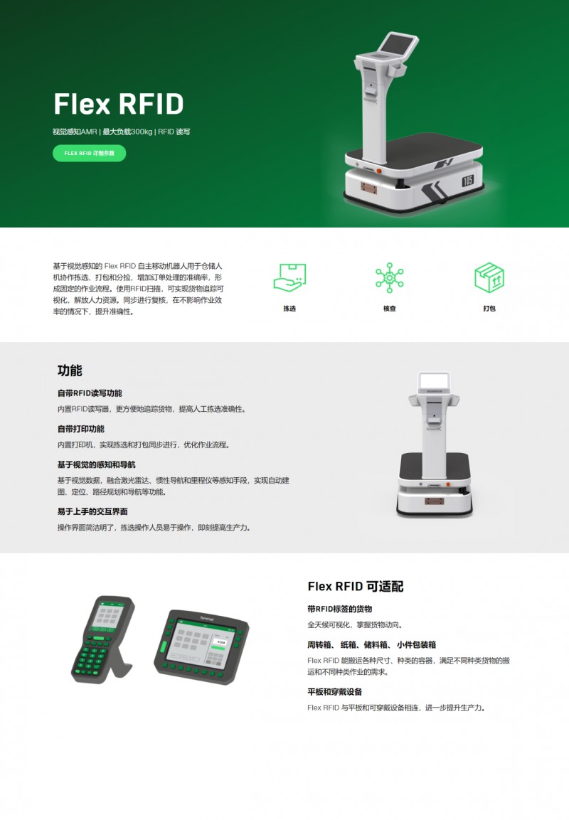 基于視覺感知的 Flex RFID 自主移動機(jī)器人用于倉儲人機(jī)協(xié)作揀選、打包和分撿,增加訂單處理的準(zhǔn)確率,形成固定的作業(yè)流程。使用RFID掃描,可實(shí)現(xiàn)貨物追蹤可視化,解放人力資源。同步進(jìn)行復(fù)核,在不影響作業(yè)效率的情況下,提升準(zhǔn)確性。