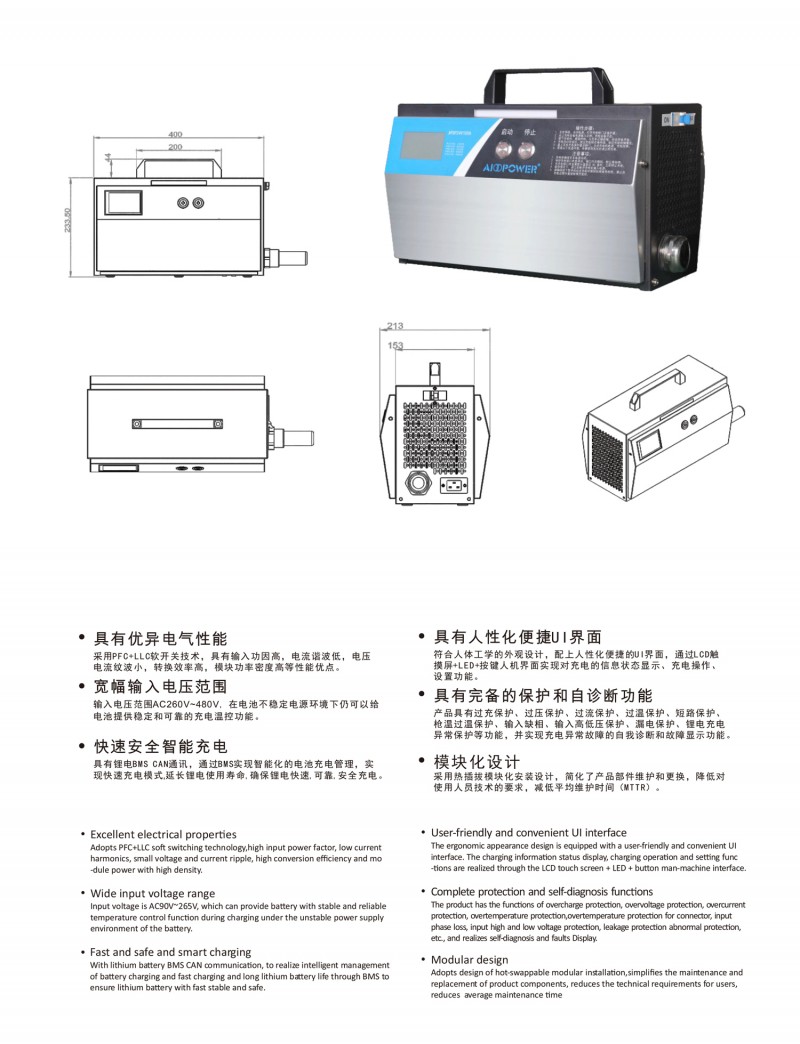 觸摸屏智能操作設計:告別傳統按鍵方式,給您帶來更現代更具科技智能的操作體驗 自動充電:插槍自動充電,簡化充電流程,便于操作 兼容性高:80V200A兼容48V200A充電 多重保護: 輸出短路,過流過壓保護,反接保護,電流導管保護等多重保護 預約充電功能:避開高峰用電時段,有效節省成本 雙語切換:中英文雙語隨需切換,跨越語言障礙,與世界接軌 人性化設計:充電機背板內部附部件明細及產品接線圖,方便客戶可更清楚的了解產品,便于維修,提高售后時效 獨特設計: 內置電磁鎖驅動模塊,防止臨時斷電鎖槍 使用壽命更長:功率模塊預留20%空間,提高模塊的使用壽命 出色內部結構: 內部結構左右出風,內部電路不容易積粉塵,提高充電機壽命