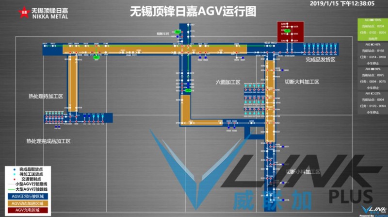 無錫頂鋒日嘉為提高物料和在制品的流轉(zhuǎn)速度,要求物料及在制品的運(yùn)輸全面采用AGV調(diào)度系統(tǒng)自動(dòng)運(yùn)輸。通過威聯(lián)加AGV智能調(diào)度系統(tǒng)的實(shí)施,實(shí)現(xiàn)AGV運(yùn)輸?shù)撵`活調(diào)度和線路優(yōu)化,大幅度提升物流的效率,實(shí)現(xiàn)快速精準(zhǔn)運(yùn)輸。路線設(shè)計(jì)根據(jù)現(xiàn)場(chǎng)狀況設(shè)計(jì)3種類型的行駛路線:AGV正常行駛區(qū)域、AGV動(dòng)態(tài)加速區(qū)域、AGV充電區(qū)域,在行駛的路線上通過各節(jié)點(diǎn)的不同功能指導(dǎo)小車的行駛路線。