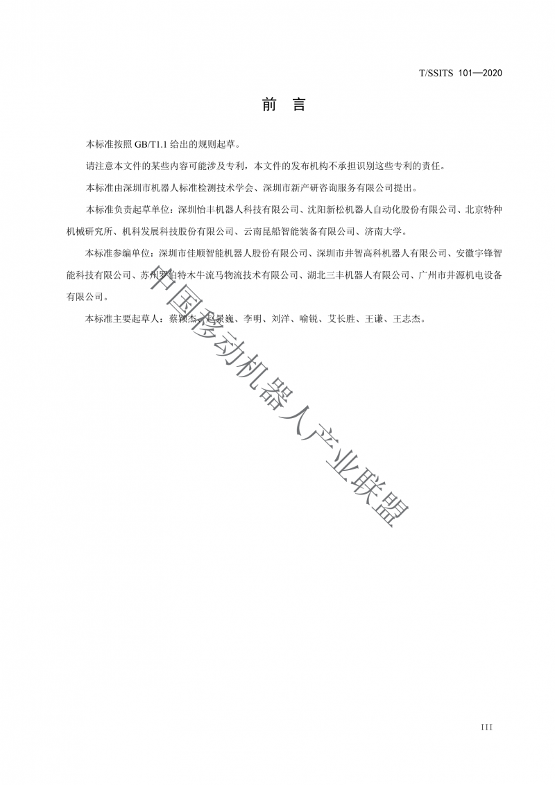 本標準參編單位∶深圳市佳順智能機器人股份有限公司、深圳市井智高科機器人有限公司、安徽宇鋒智?能科技有限公司、蘇州羅拍特木牛流馬物流技術有限公司、湖北三豐機器人有限公司、廣州市井源機電設備有限公司。?
