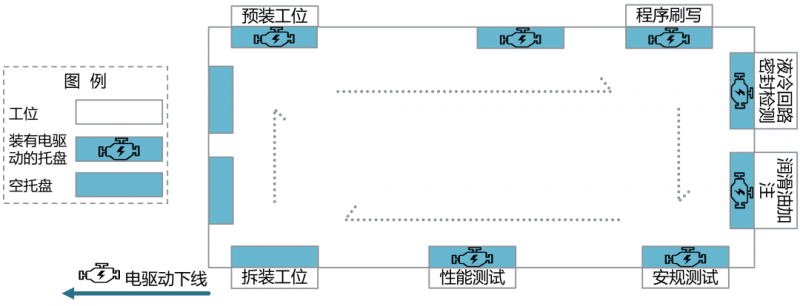 區別于原先的單工位測試,回轉式自動測試在現有下線測試形式中速度最快、效率最高,可使裝載有電驅動的托盤在線體上連續運行,并與各測試工位自動對接測試,輕松應對多達數十項的測試項目,實現電驅動的連續下線。