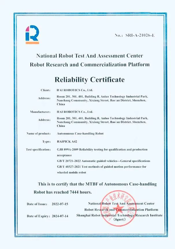 本次MTBF 認證試驗主要針對HAIPICK A42箱式倉儲機器人本體的責任故障,不包含因地面、貨箱等依賴環境等導致的非責任故障。試驗中,37臺 機器人每天24 小時持續運行,累計持續運行49728小時。通過后臺精確記錄的機器人取放貨次數、底盤行走距離、底盤旋轉次數、貨叉升降距離、充放電次數等關鍵信息分析驗證:HAIPICK A42機器人通過MTBF5000小時認證目標,實際測試結果為MTBF7440小時,相當于機器人連續310多天無故障穩定運行。