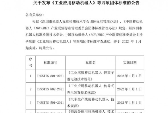 關(guān)于發(fā)布《工業(yè)應(yīng)用移動(dòng)機(jī)器人》四項(xiàng)團(tuán)體標(biāo)準(zhǔn)的公告