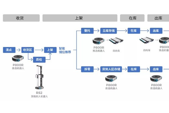 由RS5貨箱機器人、P40貨到人機器人、四向穿梭車及AI算法和智能倉庫管理系統(tǒng)(WMS)構成。