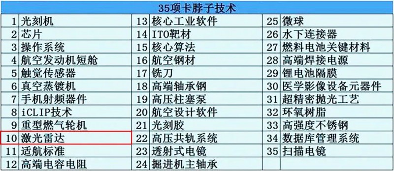 2018年《科技日報》總結了制約我國工業發展的35項“卡脖子”技術,其中第十項是激光雷達技術。