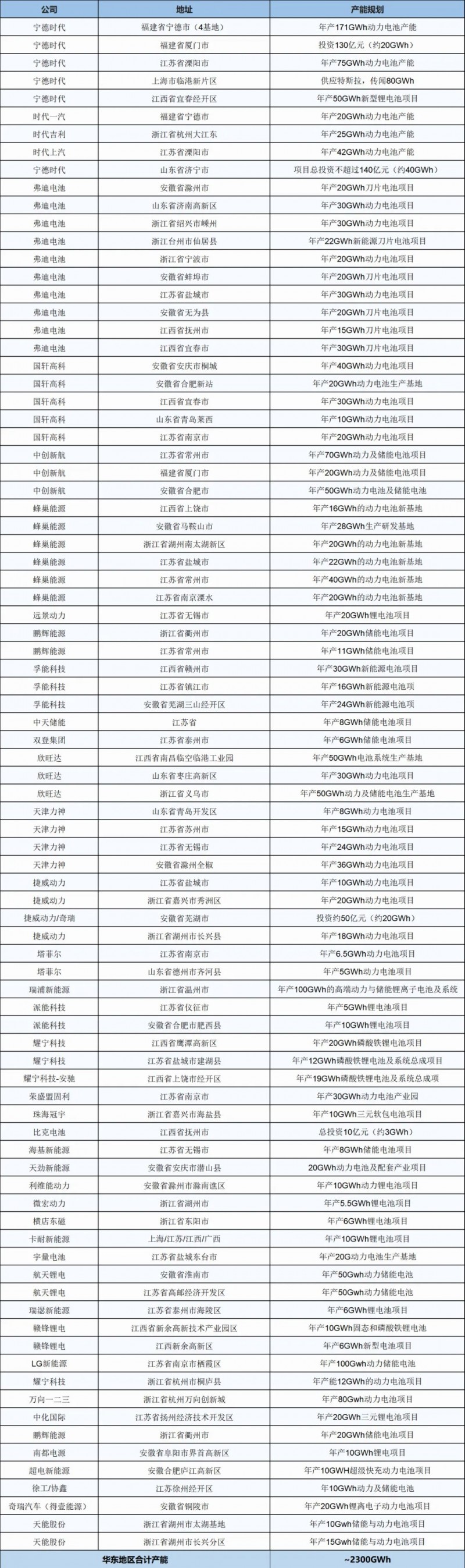 全國(guó)動(dòng)力與儲(chǔ)能電池基地產(chǎn)能統(tǒng)計(jì)表1---華東地區(qū)