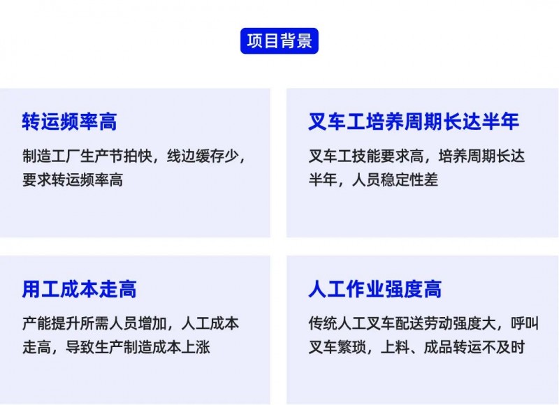 無(wú)人化搬運(yùn)削減叉車駕駛?cè)藛T8人、作業(yè)叉車4臺(tái),極大降低生產(chǎn)制造成本及叉車維護(hù)保養(yǎng),年平均節(jié)省成本近百萬(wàn)元!