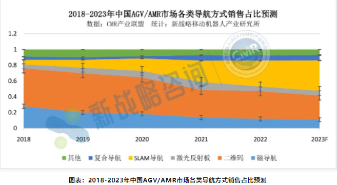 隨著工業應用移動機器人(AGV/AMR)智能化、柔性化與多樣化的發展趨勢,從導航方式來看,預測未來五年內,磁導航產品的市場新增量將會持續走低,市場占比不斷縮小,無論是展會現場展示還是企業的方案推薦,磁導航的應用空間較為有限,但一定時間內仍將存在于適用的行業;二維碼導航因其價格及適用領域的特殊性,未來很長時間內仍然占據較大比重,但占比逐漸縮??;增量最明顯的無疑屬于自然導航,激光SLAM和視覺SLAM,也就是AMR產品的快速躍升,未來將會是主流的導航方式,2022年度占比已達到32.98%,已經成為超越磁導成為第二大品類,預計2023年有望超越二維碼,成為應用最多的導航方式。