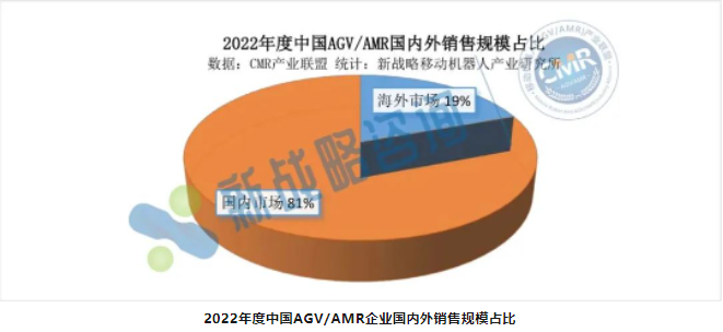 2022年,中國AGV/AMR企業(yè)在海外市場的銷售規(guī)模進一步提升,根據(jù)CMR產(chǎn)業(yè)聯(lián)盟數(shù)據(jù),新戰(zhàn)略移動機器人產(chǎn)業(yè)研究所統(tǒng)計,2022年,中國AGV/AMR企業(yè)海外銷售規(guī)模為36億,同比增長44%。從2019年中國AGV/AMR海外銷售額首次突破10億人民幣到2022年的36億人民幣,不少企業(yè)的海外銷售占比得到較大提升。