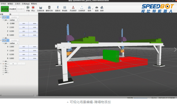 · 可視化場景編輯,用戶可在界面狀態(tài)欄中進行障礙物方位的修改、移除或添加,實現(xiàn)對桁架機器人的柔性控制。