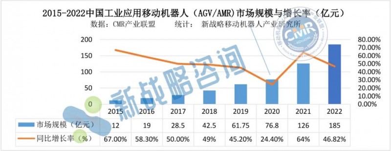 2015-2022中國工業(yè)應(yīng)用移動(dòng)機(jī)器人(AGV/AMR)市場(chǎng)規(guī)模與增長率