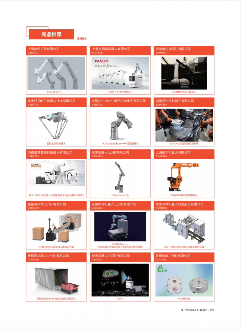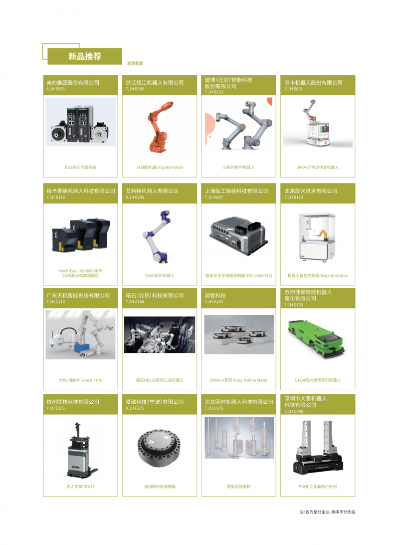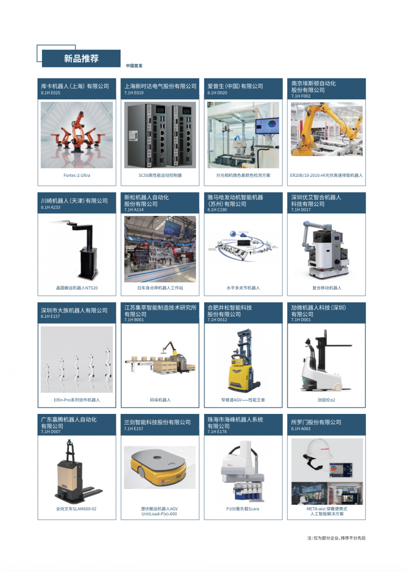 新品覆蓋了工業(yè)機(jī)器人本體、SCARA機(jī)器人、DELTA機(jī)器人、協(xié)作機(jī)器人、AGV/AMR、移動復(fù)合機(jī)器人、減速器控制器傳感器和伺服電機(jī)執(zhí)行器等核心零部件、軟件及系統(tǒng)集成應(yīng)用等,彰顯最前沿的機(jī)器人技術(shù),為新型工業(yè)化注入新動能。