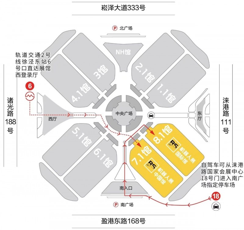 2.如果您自駕車可從國家會展中心18號口(淶港路段),進(jìn)入南廣場指定停車場。從南登錄廳即可到達(dá)7.1H&8.1H。
