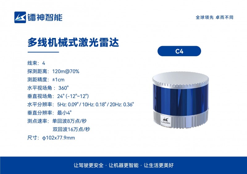 鐳神智能多線機械式激光雷達C4、C8和CH16R,產品主打高性能,價格降至“千元級”,讓客戶真正體驗到激光雷達的價值與作用,我們期待有更多客戶選擇鐳神智能激光雷達進行智能空間感知場景的開發與落地應用。