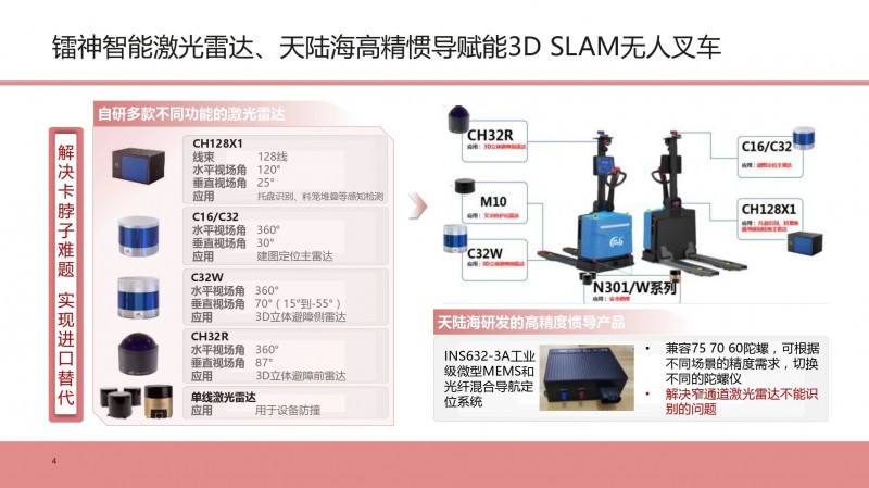在論壇分享會上介紹了無人叉車配置的技術領先全球的鐳神智能激光雷達系列產品,解決了卡脖子難題,實現國產化自主可控,每臺無人叉車周身配置7-8顆激光雷達,提供豐富穩(wěn)定的全方位立體感知信息,做到更安全、更穩(wěn)定、更可靠。