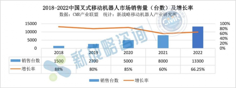 圖表:2018-2022年中國叉式移動機器人市場銷售量(臺數(shù))及增長率
