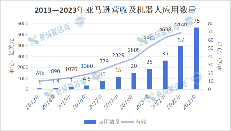 2013-2023年亞馬遜營收及機器人應用數(shù)量