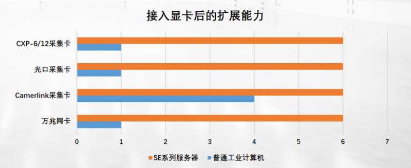 應(yīng)對(duì)需要同時(shí)處理多張采集卡數(shù)據(jù)的應(yīng)用時(shí),由于傳統(tǒng)工控機(jī)自身擴(kuò)展槽數(shù)量和顯卡厚度等因素限制,未能滿足需要的擴(kuò)展性能;而SE系列服務(wù)器其特有的多卡插槽特性和獨(dú)特槽位設(shè)計(jì),能夠在規(guī)避顯卡遮擋的同時(shí)提供至多擴(kuò)展6個(gè)PCIex8卡槽的采集卡。