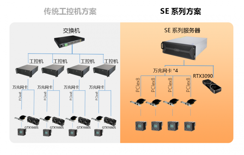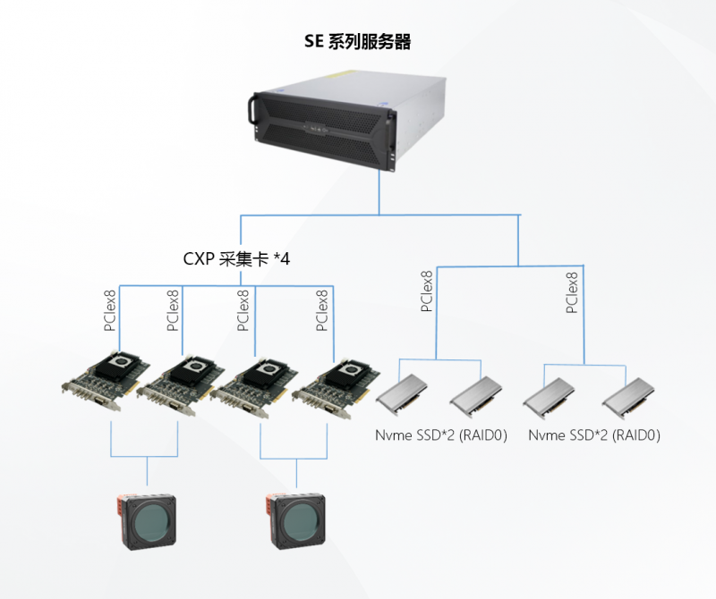 SE系列布置簡(jiǎn)單、靈活,調(diào)試更便捷;一臺(tái)設(shè)備集多卡擴(kuò)展、高速處理、高速存儲(chǔ)3合1,更省空間;搭配專業(yè)PCIe接口存儲(chǔ)設(shè)備,輕松實(shí)現(xiàn)高速存圖需求。