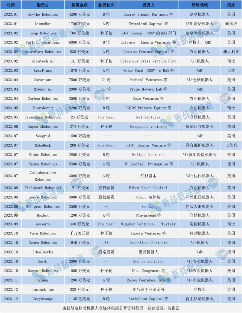 根據新戰略移動機器人產業研究所統計,2023年,國外移動機器人(AGV/AMR)領域融資事件共計31起,累計金額超7億美元,折合人民幣達50億元,最高單筆融資金額為1.35億美元。
