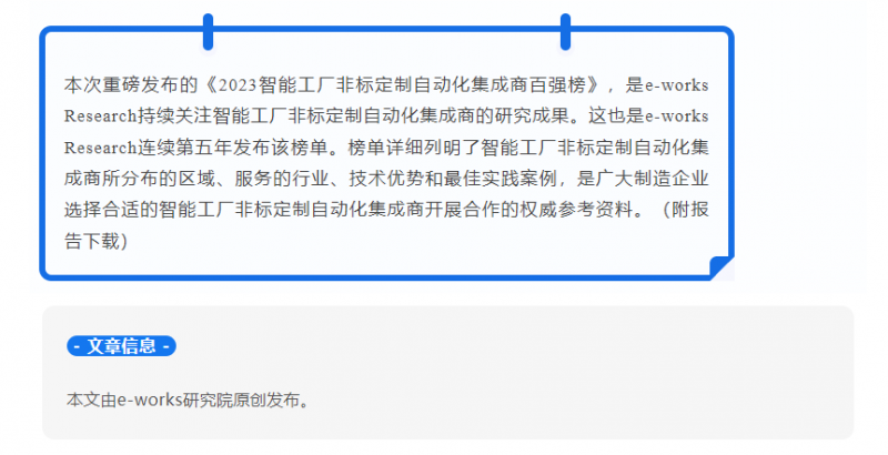 近日,e-works重磅發布了“2023智能工廠非標定制自動化集成商百強榜”,上海企業榮占十席,軒田科技榜上有名。此次是軒田科技繼2022年再次上榜,連續2年躋身中國智能工廠非標自動化集成商百強行列!
