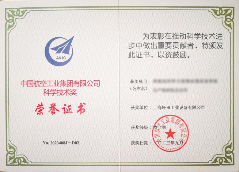 憑借持續技術創新能力、研發能力和技術領先能力,軒田科技榮膺中國航空工業集團有限公司“科學技術獎”。