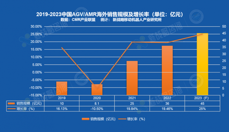 近年來,移動機器人行業的出海趨勢進一步增強。根據新戰略移動機器人產業研究所初步統計,2023年,中國AGV/AMR出口規模預計在45億左右,增長率達25%。