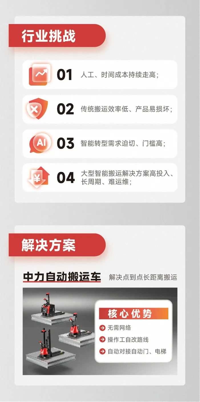 基于對市場的深度洞察,去年以來中力定義行業新概念——自動搬運車,專注解決點到點長距離無效搬運,破解用工難題?;诰珳矢咝У淖詣优渌停辛ψ詣影徇\車助力生產效率大幅提升!