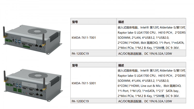 KMDA-7611是一款高性能箱體電腦,采用H610芯片組,搭載Intel®第12代Alder lake-S/第13代Raptor lake-S系列處理器,IO功能完整,體積大小適中,適用于無人叉車、機(jī)器視覺和工業(yè)控制等行業(yè)和領(lǐng)域。