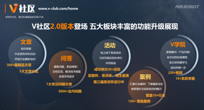 V社區(qū)升級(jí)至2.0版本,已形成文章、問(wèn)答、活動(dòng)、案例、V學(xué)院五大板塊,匯集350多篇精品文章、330多條講解及應(yīng)用視頻、5000多個(gè)專業(yè)問(wèn)題、120多個(gè)實(shí)踐案例、20多場(chǎng)活動(dòng),助力機(jī)器視覺(jué)愛(ài)好者快速學(xué)習(xí)成長(zhǎng)。