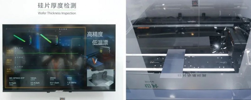 該環(huán)節(jié)還展示了硅片厚度/側(cè)邊檢測方案。其中,六臺(tái)3D激光輪廓傳感器測試硅片厚度,六臺(tái)相機(jī)兩兩對(duì)射,同時(shí)測量三組數(shù)據(jù)結(jié)果。硅片平均厚度數(shù)據(jù)重復(fù)性精度≤0.5μm,TTV(單線厚度波動(dòng))重復(fù)性精度≤1.5μm,線痕(單線輪廓高度)重復(fù)性精度≤2μm。