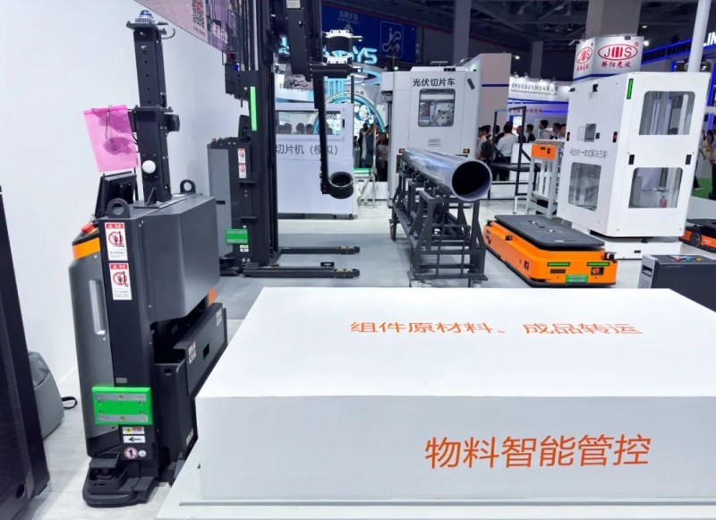 拉晶環(huán)節(jié)展示了自主設(shè)計(jì)研發(fā)的自動(dòng)取晶AMR和重載AMR,二者協(xié)同作業(yè),取晶AMR從料架上取放晶棒,重載AMR進(jìn)行轉(zhuǎn)運(yùn)料架,實(shí)現(xiàn)晶棒自動(dòng)化下線和實(shí)時(shí)轉(zhuǎn)運(yùn)。
