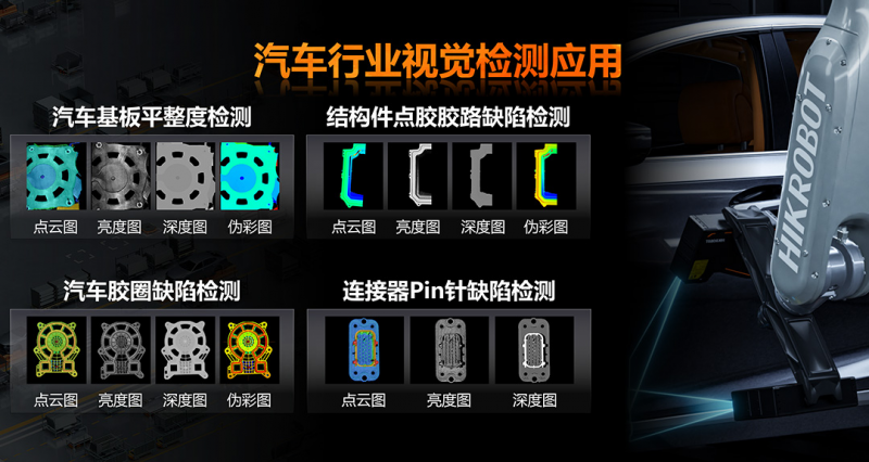 在汽車行業中,質量缺陷檢測至關重要。海康機器人擁有成熟的產品和解決方案,可應用于多個環節,包括汽車基板平整度檢測、深度圖與點云圖的拼接,以及結構件點膠膠路缺陷檢測和連接器Pin針缺陷檢測等。