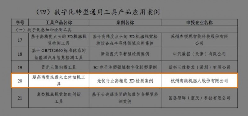 近日,工業和信息化部辦公廳公布2024實數融合典型案例名單,海康機器人“超高精度線激光立體相機工具-光伏行業高精度3D檢測案例”脫穎而出,入選其中的數字化轉型通用工具產品應用案例名單。