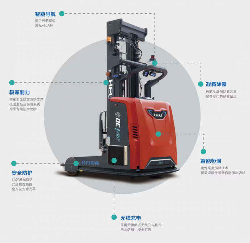 合力憑借深厚的技術沉淀和豐富的制造經(jīng)驗,推出冷鏈專用版叉車AGV。基于“優(yōu)質本體+先進控制+溫濕系統(tǒng)+智能平臺”打造領先一代的冷庫叉車AGV—CQD系列,成功攻克了-30℃極低溫度環(huán)境下的“高位存儲+智能堆疊+接駁搬運”等場景一體化作業(yè)難題。