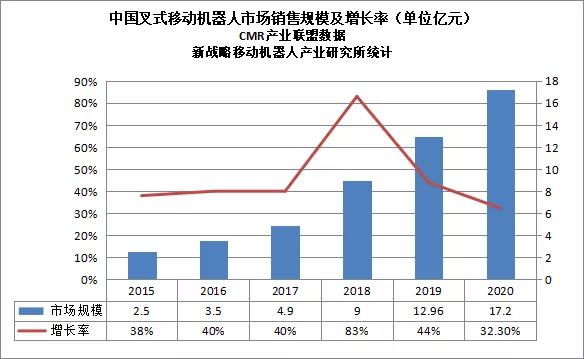 圖表1:2015-2020中國叉式移動機(jī)器人市場銷售規(guī)模及增長率(單位億元)