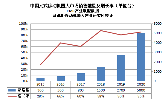 圖表2:2015-2020中國叉式移動機(jī)器人市場銷售數(shù)量及增長率(單位臺)