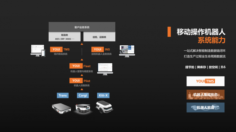 優(yōu)艾智合是國內(nèi)最早布局軟件系統(tǒng)的移動(dòng)機(jī)器人企業(yè)。以針對(duì)制造業(yè)打造的YOUI TMS智慧物流系統(tǒng)為例,其能將移動(dòng)機(jī)器人在工序間的物理流轉(zhuǎn)升級(jí)為數(shù)據(jù)連接,具備根據(jù)ERP、WMS、MES等企業(yè)信息系統(tǒng)進(jìn)行整體物流自主調(diào)度的能力,完成備料倉到產(chǎn)線再至成品倉的物流數(shù)據(jù)全覆蓋。