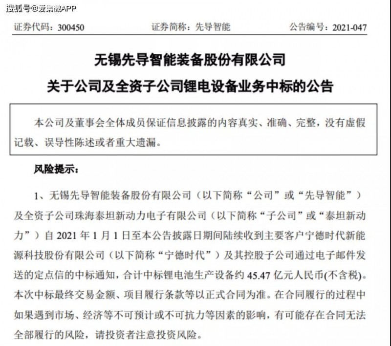 5月31日晚間,無錫先導智能裝備股份有限公司(簡稱“先導智能”)發(fā)布公告稱,先導智能及全資子公司泰坦新動力自2021年1月1日至公告披露日期間陸續(xù)收到主要客戶寧德時代新能源科技股份有限公司(以下簡稱“寧德時代”)及其控股子公司通過電子郵件發(fā)送的定點信的中標通知,合計中標鋰電池生產設備約45.47億元人民幣。