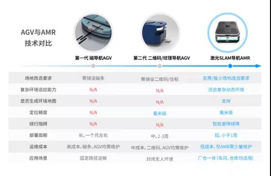 其實,AGV發展至今已經歷了三次技術變革。行業內普遍依據導航方式的不同將其劃為:第一代磁導航AGV,第二代二維碼/信標導航AGV,以及第三代自然導航AGV,又稱AMR(自主移動機器人)。