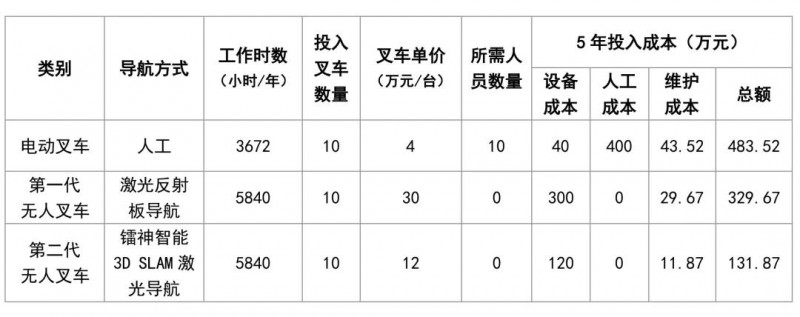 上表假定了某倉庫分別投入10輛電動叉車、激光反射板導航叉車、3D SLAM激光導航叉車,并以5年折舊進行投資回報對比分析。顯然,人工操作的電動叉車投入成本最高,經(jīng)濟回報效益最低;激光反射板導航叉車雖然單臺叉車成本高,但在五年折舊期后總投入還是比人工的電動叉車要節(jié)省了153.85萬元,近32%的成本;而采用鐳神智能3D SLAM激光導航方案的無人叉車,五年總投入成本僅131.87萬,比人工電動叉車節(jié)省了73%的投入成本、59%的時間成本,而且五年期間倉庫可以靈活進行擴建或調(diào)整,全面滿足工業(yè)互聯(lián)網(wǎng)時代下客戶終端市場隨時變化的需求,具有更突出的綜合效益!
