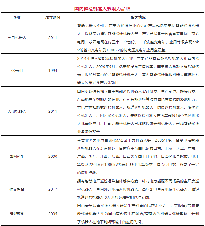 市場(chǎng)空間的廣闊吸引了更多的入局者,近年來(lái),越來(lái)越多的機(jī)器人制造廠商投入到變電站巡檢機(jī)器人的設(shè)計(jì)、研發(fā)和銷售,據(jù)統(tǒng)計(jì),目前國(guó)內(nèi)已有25家左右具有一定規(guī)模的巡檢機(jī)器人制造廠商,并已研制出適應(yīng)于不同環(huán)境條件的巡檢機(jī)器人。以下盤(pán)點(diǎn)了當(dāng)前國(guó)內(nèi)巡檢機(jī)器人市場(chǎng)一些影響力品牌,供大家參考!