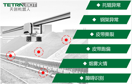通過(guò)機(jī)器人搭載采集高清視頻圖像,利用巡檢AI算法,有效判斷皮帶跑偏,表面撕裂,路面灑落礦渣等設(shè)備故障或生產(chǎn)事故,并將告警信息及時(shí)反饋至控制中心,由工作人員及時(shí)進(jìn)行處理。