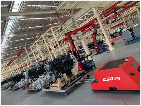 某著名工程機械公司的“超級試驗工廠”,應用了由CSG華曉為其量身定制的91臺AGV。主線配備43臺大型定制裝配AGV,單臺承重超過10T,可實現1m/min~30m/min無級變速。相較傳統拖鏈裝配線具有高度的柔性化,是實現裝配自動化的基礎。SPS潛伏式牽引AGV37臺,平衡懸架、前中后橋分裝頂升背負AGV 5臺,發動機分裝后牽引AGV 7臺,駕駛室分裝潛伏式牽引AGV 24臺,實現了全廠區內無人化物流轉運。