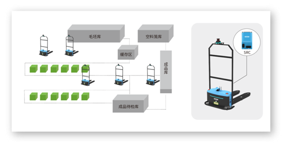 根據現場車間情況,SEER通過仙工智能企業數字化中臺系統與用戶的MES、WMS系統無縫對接,實現業務需求獲取并下發,調度系統指派基于SRC的激光SLAM地面式自動叉車完成運輸任務,助力客戶實現了車間與倉庫的智能化物流。
