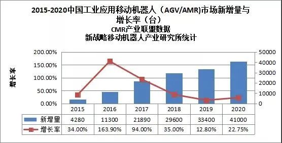 圖:2015-2020中國工業(yè)應(yīng)用移動機(jī)器人(AGV/AMR)市場新增量(臺)與增長率