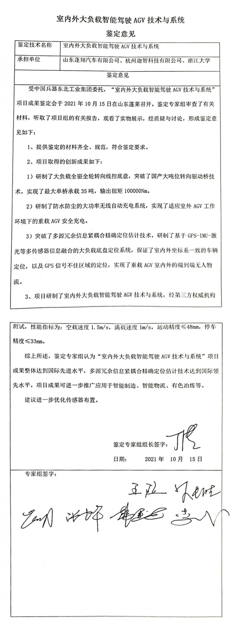 10月15日,由中國(guó)兵器集團(tuán)民品發(fā)展部、東北工業(yè)集團(tuán)、山東蓬翔汽車有限公司、杭州迦智科技有限公司主辦,煙臺(tái)市蓬萊區(qū)人民政府、中國(guó)移動(dòng)機(jī)器人(AGV/AMR)產(chǎn)業(yè)聯(lián)盟協(xié)辦的“蓬翔重載AGV產(chǎn)品鑒定大會(huì)”及“蓬翔汽車室內(nèi)外重載
