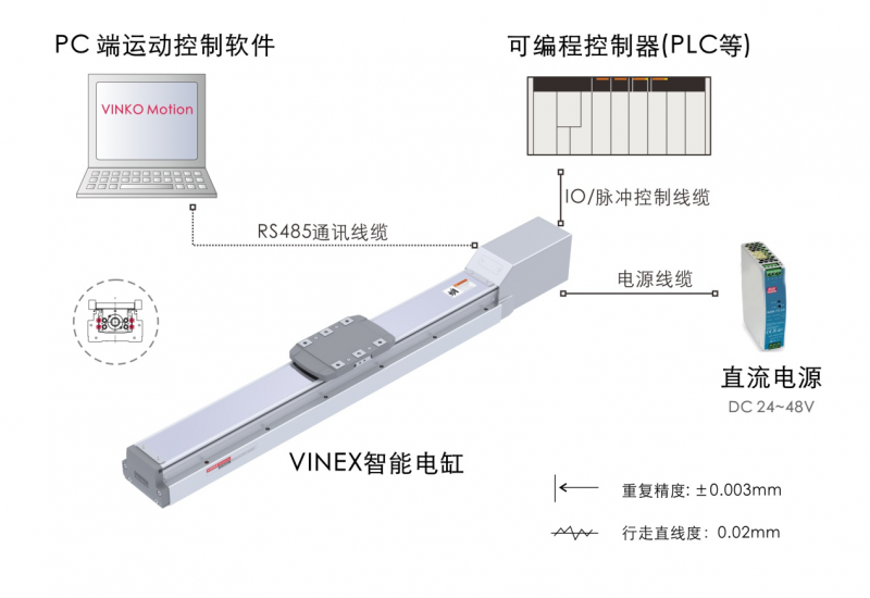 Vinex S系列為點位脈沖型電缸。可兼容PIO定位模式,脈沖模式和485通訊模式。Vinex Q系列為總線型電缸,可通過EtherCAT總線,實現(xiàn)與PLC的通訊控制,實現(xiàn)多軸聯(lián)機和總線控制。