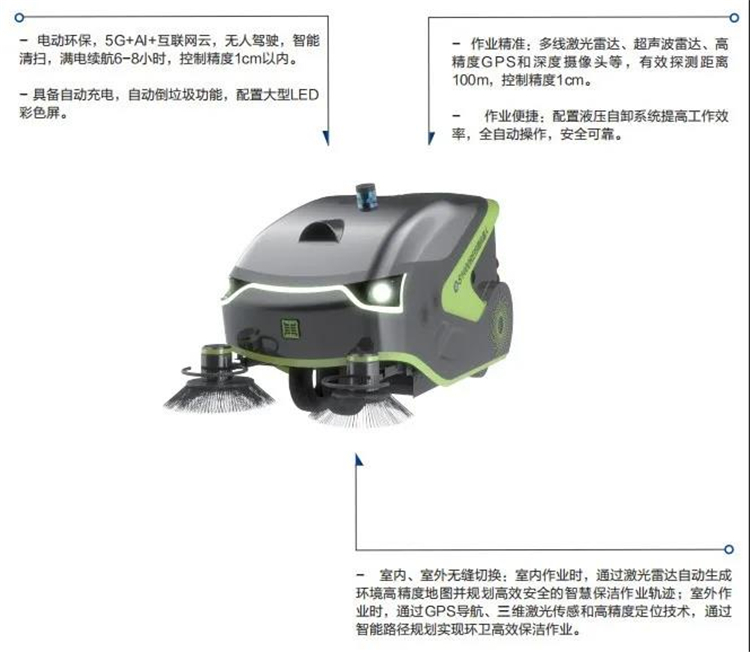 山東魯環(huán)機(jī)械設(shè)備有限公司所發(fā)布的5G無(wú)人駕駛新能源掃地車(chē),基于5G+無(wú)人環(huán)衛(wèi)AI大腦,無(wú)人駕駛智能清掃車(chē)基于自動(dòng)駕駛控制器,能實(shí)現(xiàn)智能化和無(wú)人化作業(yè)。當(dāng)